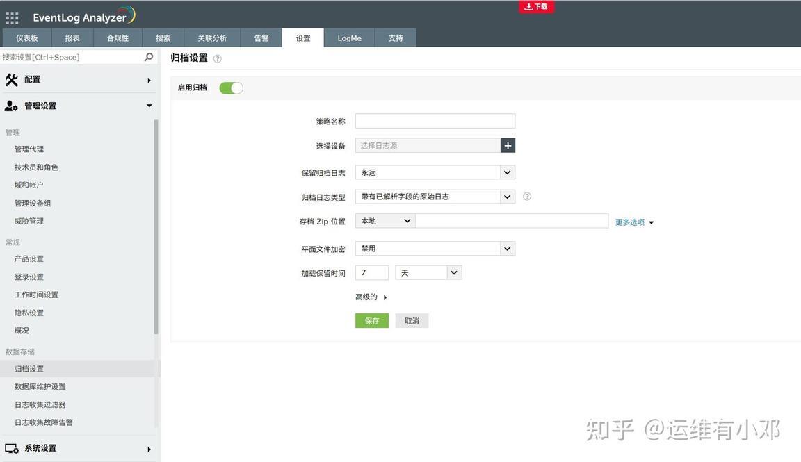 EventLog Analyzer 支持指定事件日志归档的天数,从而实现日志归档的自动化(如下图所示)。在归档周期设置完成后,EventLog Analyzer 会自动将事件日志整理到文件夹中,并在加密之前对文件夹进行压缩,以确保日志完整性并防止篡改。在需要时,归档的日志文件可以导入到 EventLog Analyzer 中用于取证分析。