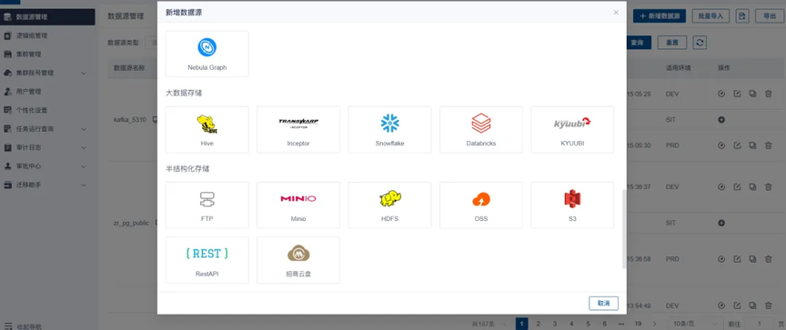 在数据源管理页面点击“新增数据源”,在当前页面弹窗打开新增数据源页面,点击数据源类型,进入对应数据源类型的配置页面。