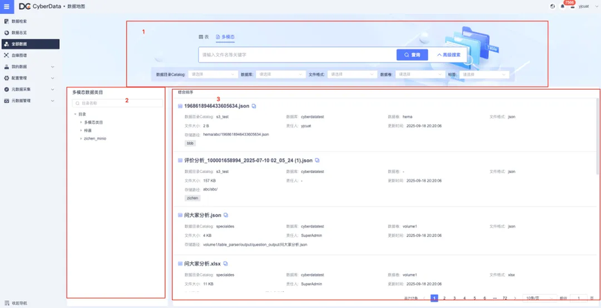 数据查找效率倍增!多模态数据检索功能支持文件名模糊查询,结合目录、Catalog、数据库等多维度过滤条件,可精准定位目标数据;类目管理功能可在 “数据地图” 模块配置类目导航,自定义分类规则后,用户查看数据时只需通过类目筛选,即可快速锁定目标文件,充分适配多样化的管理需求。此外,该平台还支持通过文件名检索多模态数据,并可依据所在目录、数据目录 Catalog、数据库、数据卷、文件格式、标签等维度完成表级过滤。