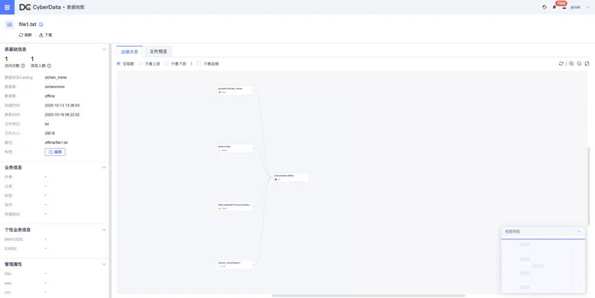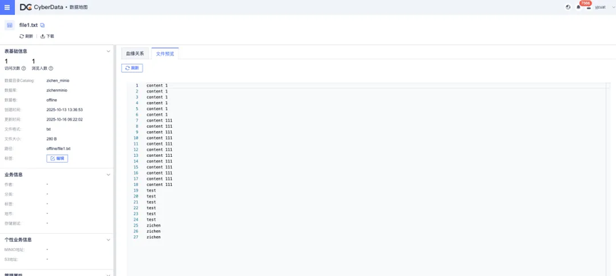 进入多模态数据详情页面,查看的基础信息、业务信息、管理属性、血缘关系、文件预览。