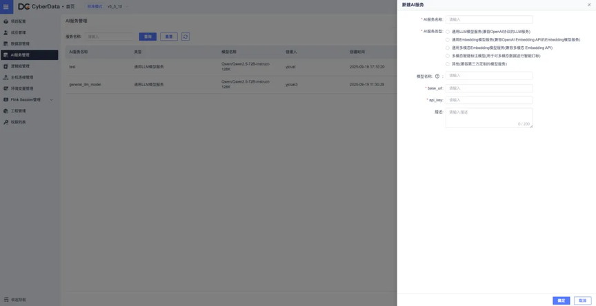 在新建 AI 服务页面,填写配置信息,点击“确定”,则 AI 服务连接保存成功。