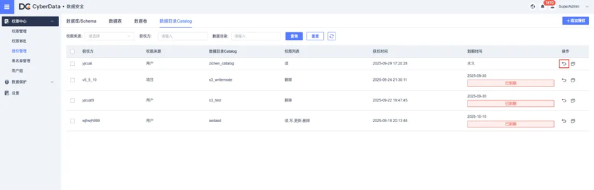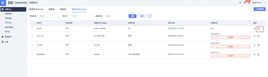 选择数据安全点击后,进入数据安全>权限中心>授权管理>数据目录 catalog 页面。