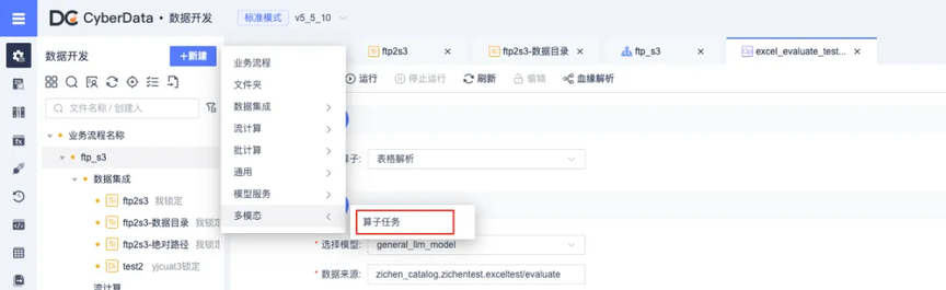 进入数据开发,点击“新建”,选择多模态>算子任务并点击。可以找到相应的业务流程,右键点击批计算,选择新建节点并点击算子任务。