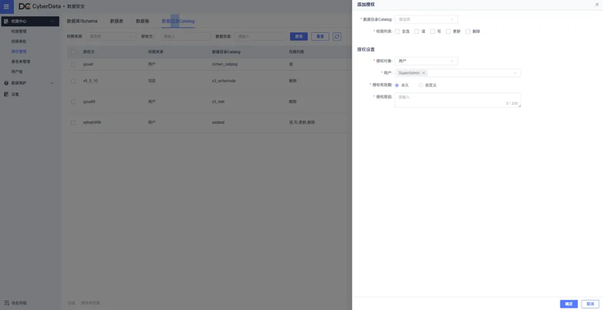 在数据目录 catalog 页面,点击“添加授权”,在添加授权弹窗页面设置授权信息后,单击确定按钮,增加新的获权方。