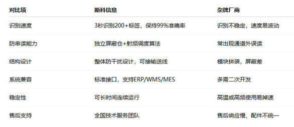多数杂牌设备采用拼装模块方案,缺乏射频算法调优,容易出现漏读、串读、速度波动等问题。