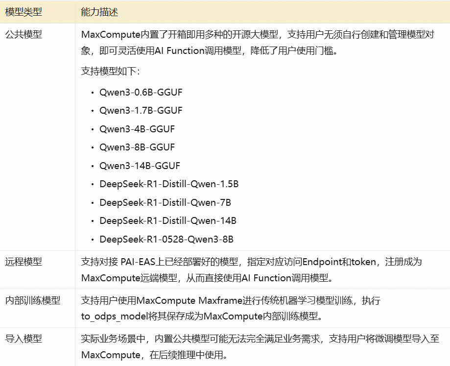 MaxCompute 提供了 基于 SQL 语言的 SQL AI Function,支持指定 MaxCompute 模型对象进行推理调用,包括内置提供的公共大语言模型,用户导入模型及远程模型,让 SQL 开发者可以用熟悉的 SQL 语言轻松驾驭大模型!