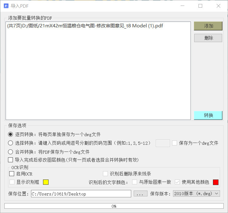 7)、可批量添加多张 pdf 图纸,点击转换后可将选择的 pdf 图纸转换为 cad 图纸。
