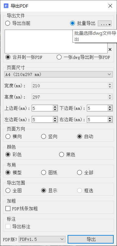 B 批量导出时,可合并导出为一个 pdf 文件,或者每个 cad 图纸导出一个 pdf 图纸。