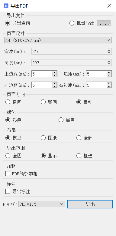 3)、在“导入 PDF”对话框中可以设置页面尺寸、页面方向、颜色、导出范围、是否加粗以及是否导出标注,并且还可以设置导出的 PDF 版本;