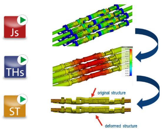 为了计算这些错综复杂的电、热、力耦合效应,CST 工作室套装提供稳态热求解器(THs)、瞬态热求解器(THt)、共轭传热求解器(CHT)和结构应力求解器(ST)。这些多物理场求解器与电磁求解器紧密配合,用户只需要创建 EM-MPS 流程,CST 可以自动把电磁求解器计算出的 Thermal Loss 传递到热求解器和结构应力求解器,计算出的温度分布和形变传递回电磁仿真,以便进行敏感度分析,也能进行收敛性分析,从而形成了一个从电、热、力闭环的多物理场分析的过程。