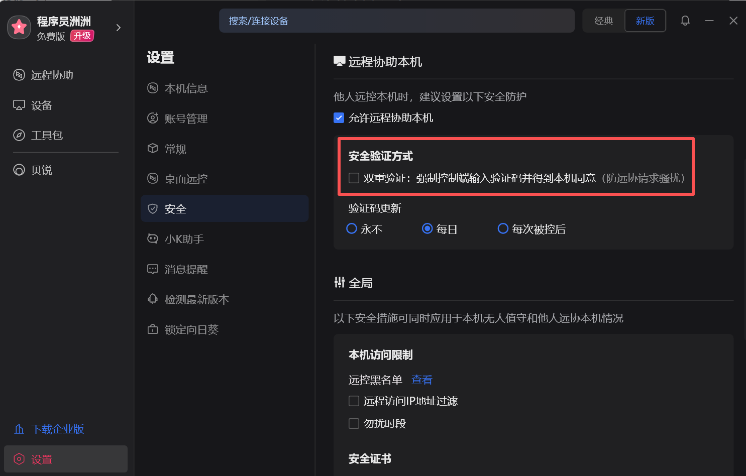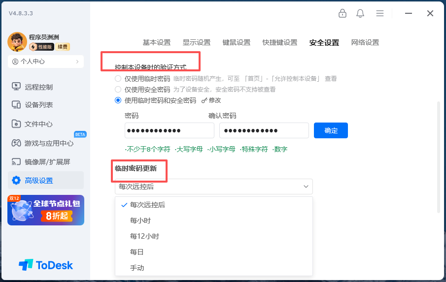 ToDesk 还支持进行多种维度的身份验证,首先是本设备的验证方式,ToDesk 支持设置临时密码和安全密码两种密码,也可以单选其中一项。其中,安全密码可自定义并有严格要求;临时密码也提供了 5 种更新方式,这里我一般选择“每次远控后”,提升了连接过程中的安全保护。