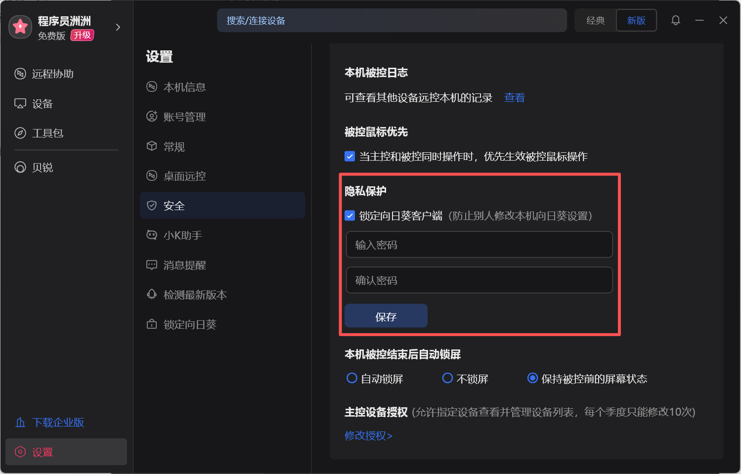 目前向日葵也提供了客户端锁定功能,这一点和 ToDesk 使用上的体验是一样的,也是能够锁定客户端防止他人进行远控信息修改或获取。
