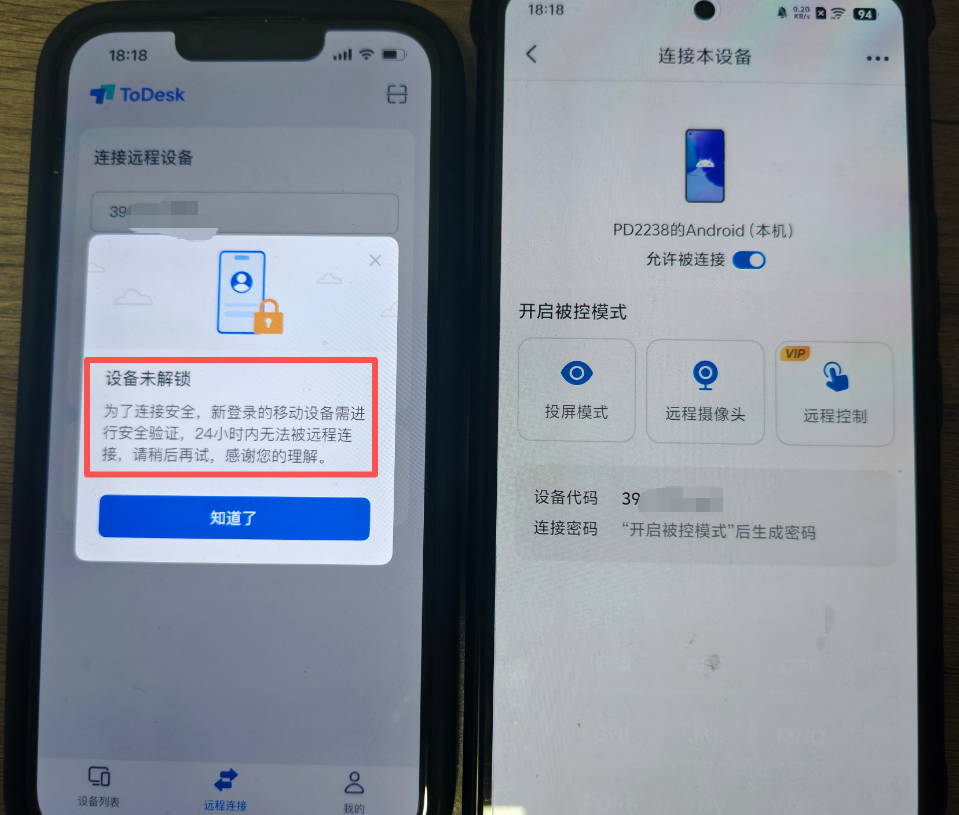 24 小时等待期机制要求新用户登录后需等待 24 小时才能启用手机被控功能,这种时间上的缓冲设计能有效防止冲动决策和诈骗行为。下图是主控手机来控制被控手机的提示。