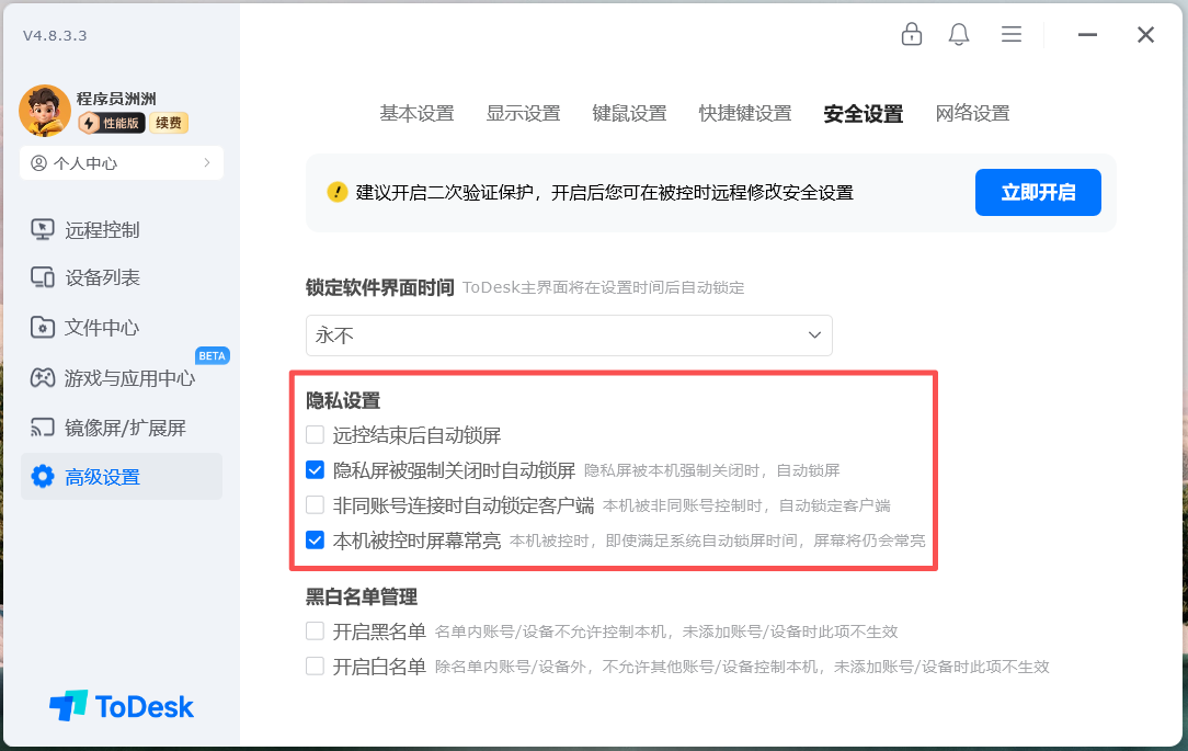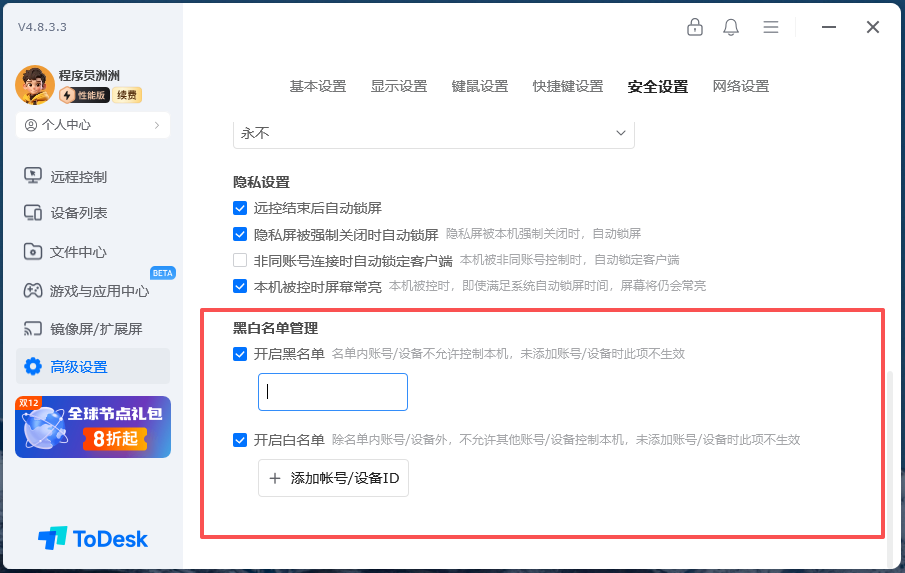 “黑名单” 可添加指定账号或设备 ID,被列入名单的对象将无法控制本机,适合屏蔽已知的风险账号;而 “白名单” 则是 “仅允许指定对象访问” 的严格权限机制 —— 除了添加到白名单的账号 / 设备,其他所有对象都无法发起控制,相当于给远程权限上了 “专属锁”。