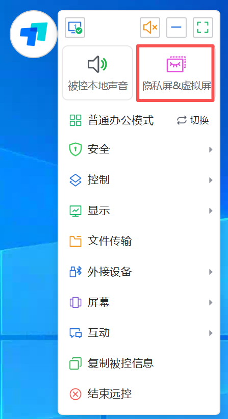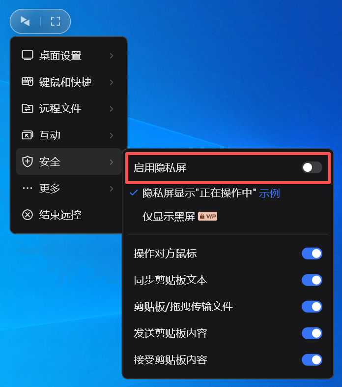 向日葵也提供了隐私屏保护功能,能够进行对应隐私屏幕保护。通过悬浮球中有这个功能。