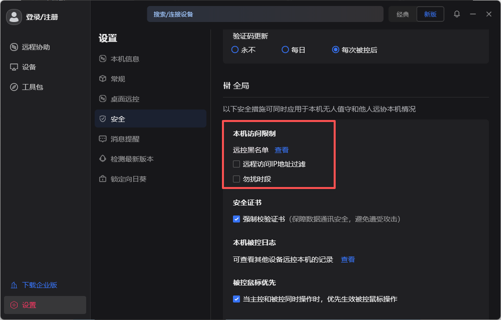其次,是一般安全验证,包括 控制本设备的连接设置、控制本设备验证方式设置、历史连接密码保存设置、锁定软件界面时间设置、隐私设置、黑白名单设置等等。