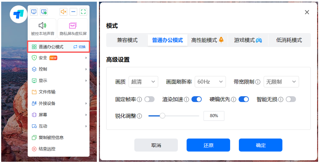 这里我贴几个 ToDesk 悬浮球中让我眼前一亮的功能!说实话,ToDesk 的远控功能确实牛。一个是控制模式, 能够有多种模式。并且 ToDesk 可以满足 1080p 最高到 360,2k 到 240,4k 到 144,8k 到 60 的帧率要求。
