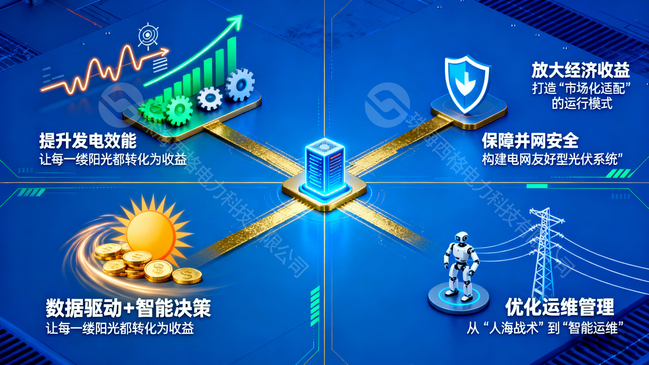 光伏策略控制服务器的核心价值,在于通过“数据驱动+智能决策”,针对性破解上述行业痛点,从发电效能、并网安全、运维管理、经济收益四个维度为光伏系统赋能,实现从“被动运行”到“主动优化”的转变。