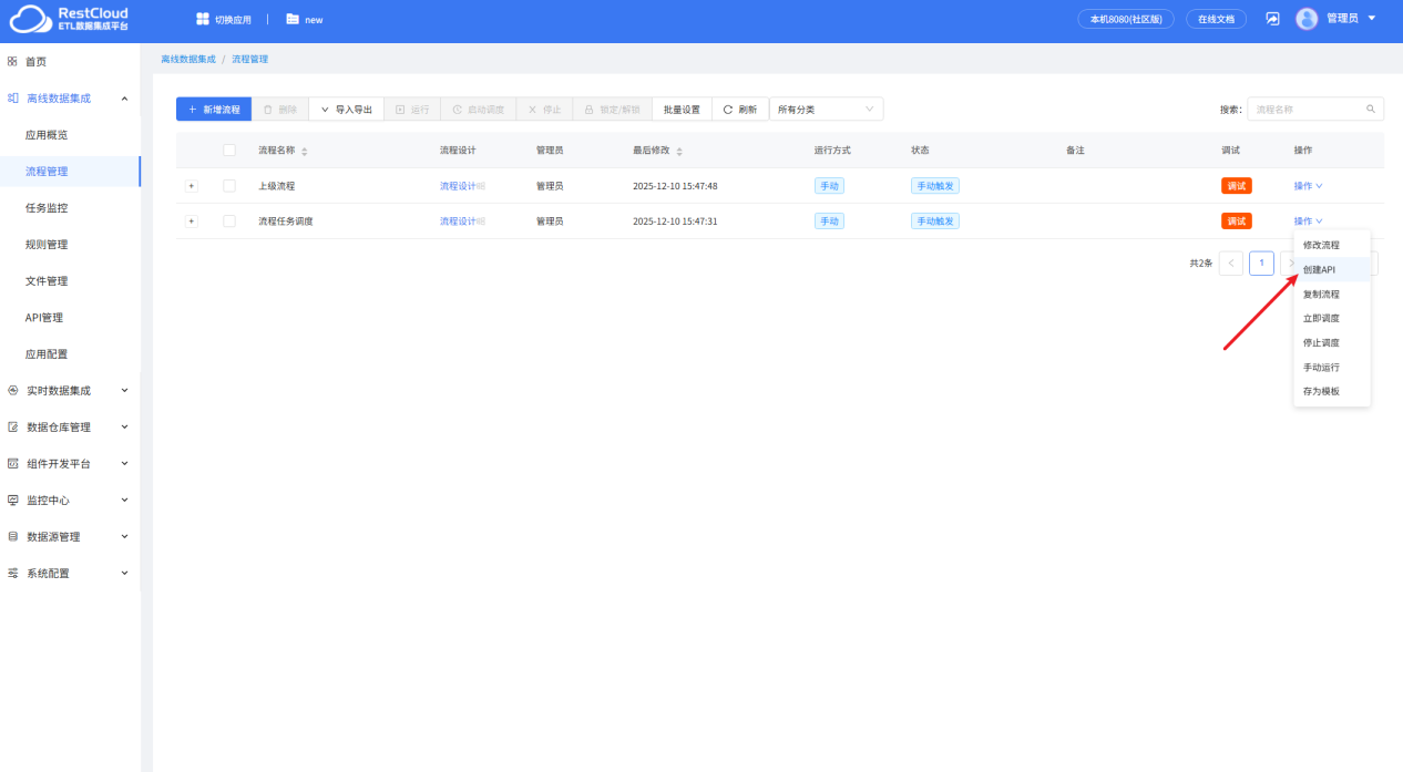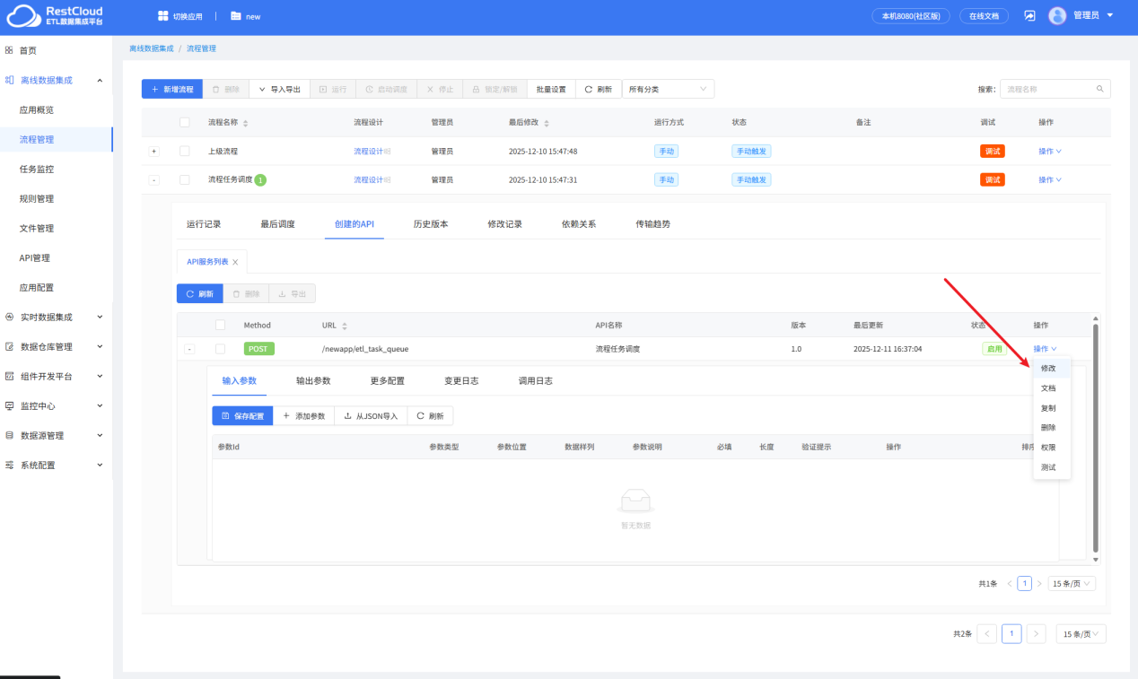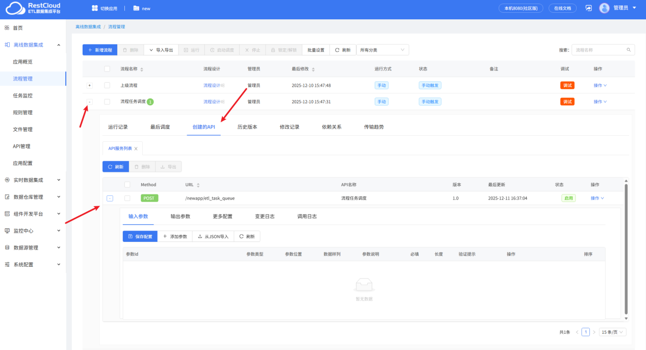 ETLCloud 提供的多种流程调度方式,覆盖了从即时交互到自动化运维、从内部调度到外部集成的各类场景。无论是需要即时调试验证的手动执行,还是按计划自动运行的定时调度;无论是依赖关系严谨的数仓任务链,还是灵活对接外部系统的 API 调用,每一种调度模式都对应着不同的业务需求与技术架构。