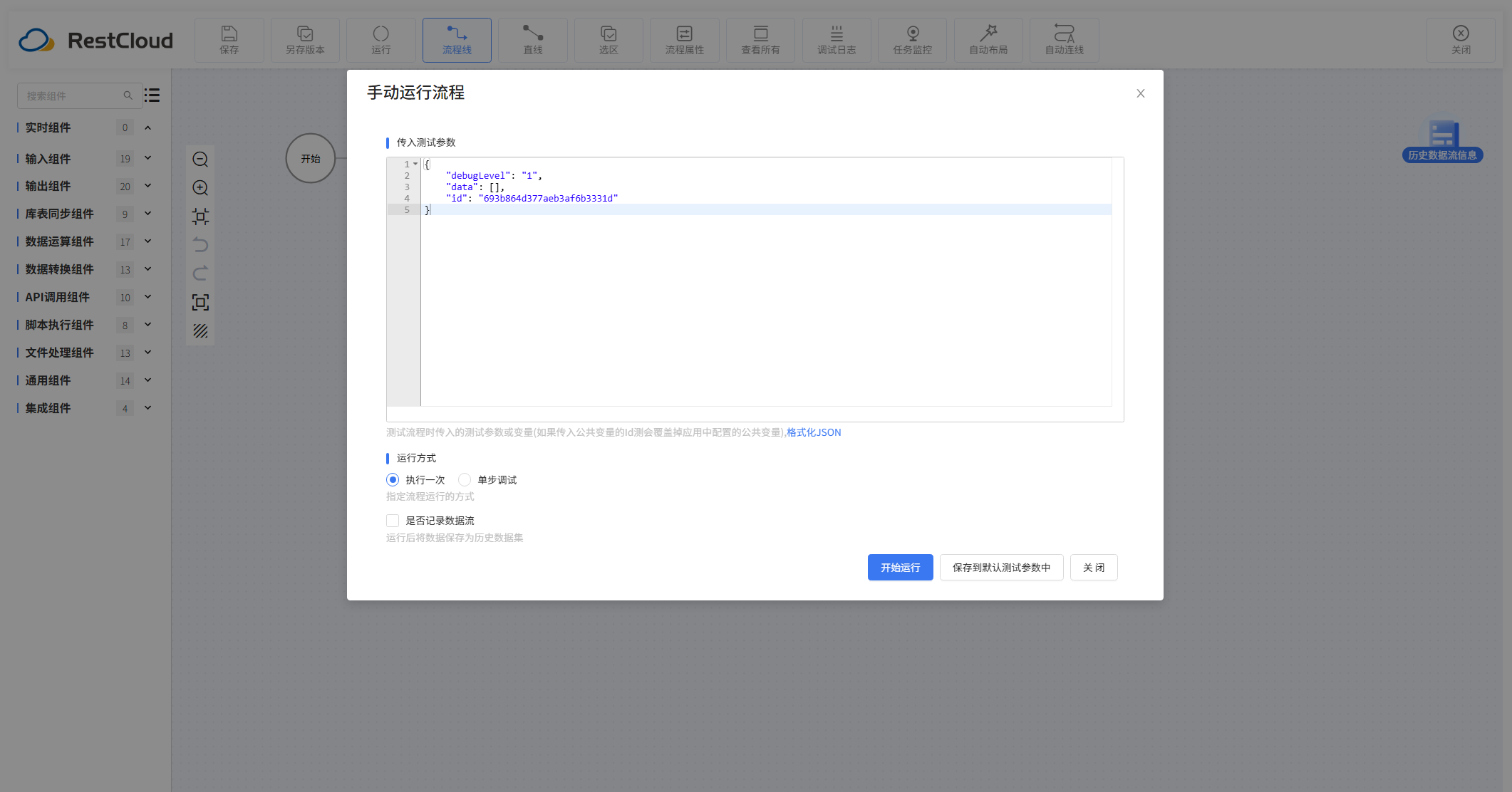 流程设计页内运行可以选直接执行流程和单步调试运行流程,单步调试流程可以看到每个节点的数据流,清楚知道数据在流程中的处理情况。