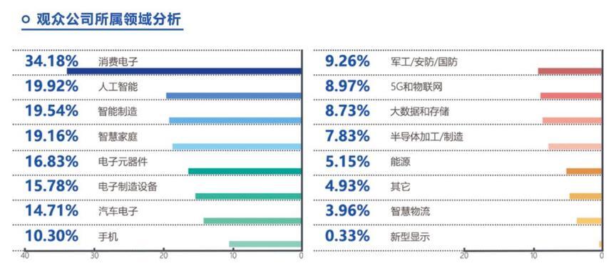 CITE2026 观众群体覆盖电子信息全产业链,其专业领域构成呈现多元化分布特征。根据展会观众数据统计分析,各领域观众占比排名依次为:消费电子(占比最高)、人工智能、智能制造、智慧家庭、电子元器件、电子制造设备、汽车电子、手机终端、军工/安防/国防、5G 与物联网、大数据及存储、半导体加工制造、能源领域。 这一分布结构充分体现了展会作为电子信息产业全要素展示平台,覆盖了产业链各关键环节的专业观众群体。