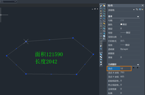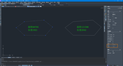 在特性栏里,通过查询多段线的顶点,发现左侧多段线图形有 6 个顶点,而右侧多段线图形有 12 个顶点,每个直线段上都有一个重合的线段,所以其面积与长度与左侧图形不一样。