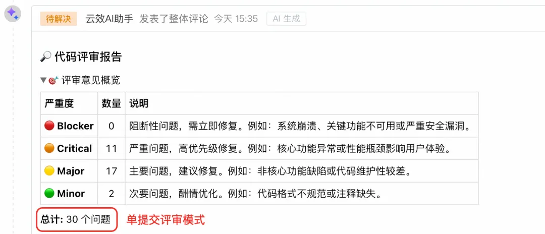 单提交评审模式:对 MR 中的每一次 commit 逐一评审,AI 会把对应的 diff 与 commit message 联合分析,产出风险提示、代码问题与可操作的修复建议。