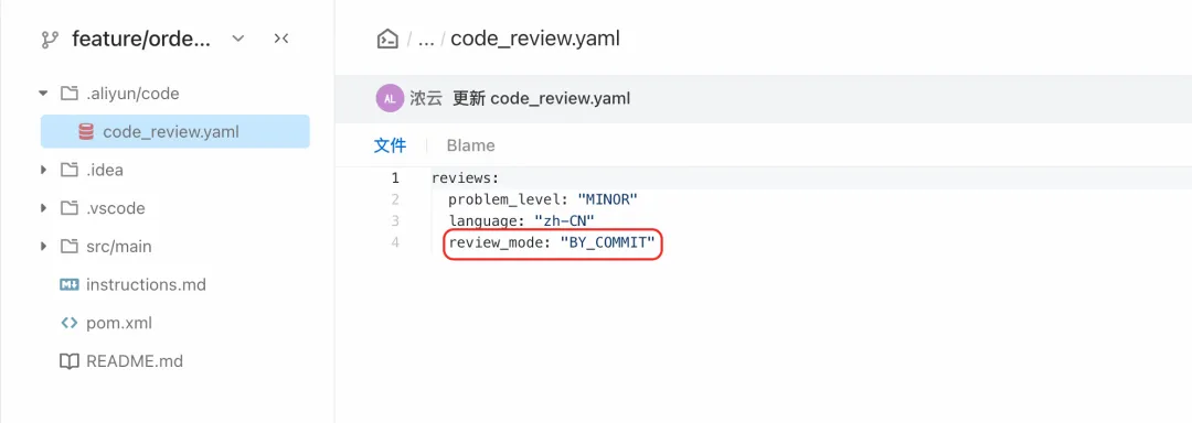 参考自定义 AI 评审规则,在源分支下的 AI 评审规则文件 .aliyun/code/code_review.yaml 中设置评审模式 review_mode 为 BY_COMMIT,即单提交评审模式。