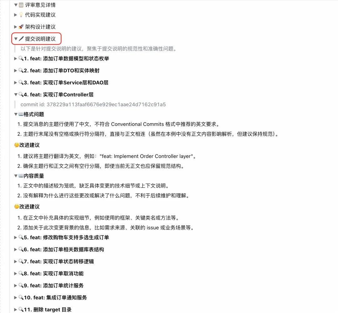 评审时结合提交说明:逐个评审 commit 时通过将 commit message 带入上下文中,AI 能关联起 diff 与对应的 message,理解开发者的真实意图(bug 修复、性能优化、兼容性调整等),从而给出更贴切的建议和更少的误判。