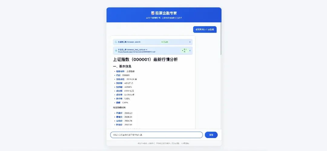 我们基于此能力打造了“金融股票专家”应用:用户输入股票名称或代码,Agent 自动打开财经网站,抓取最新行情、财报摘要与新闻舆情,综合分析后生成投资建议。