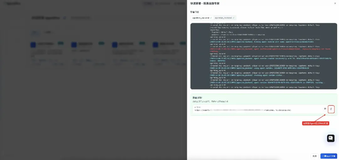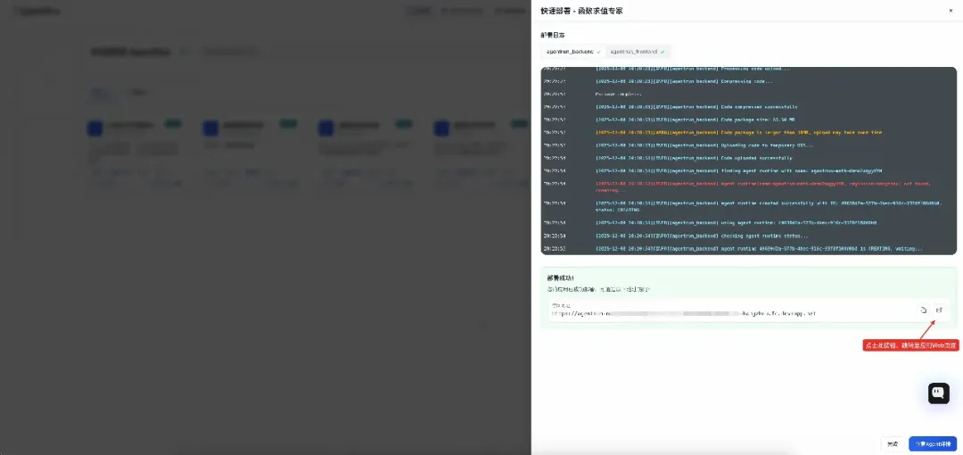 等待部署成功,点击此按钮,跳转至应用体验页面