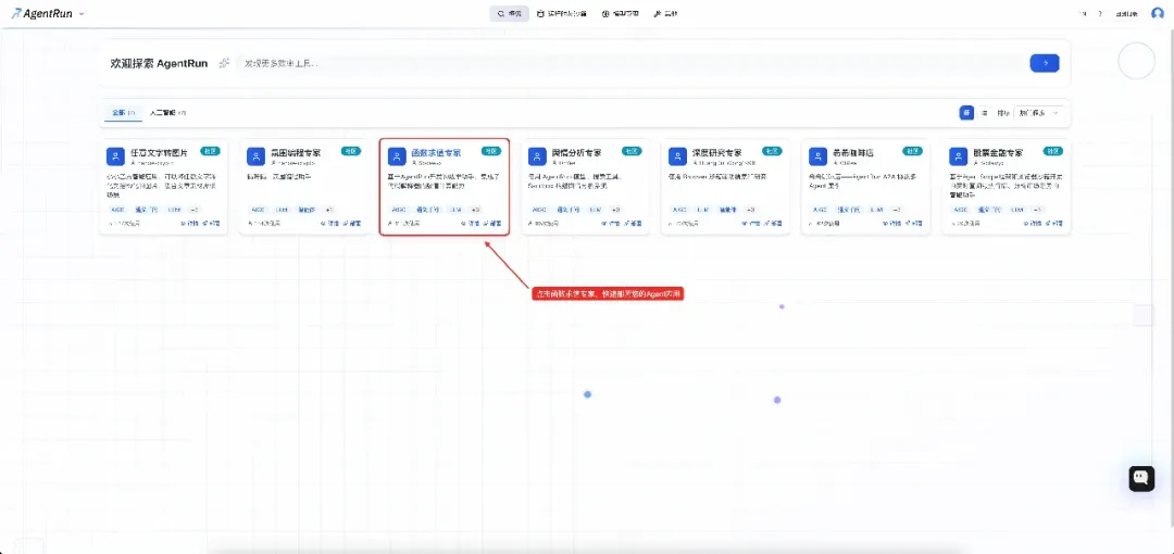 进入探索页面,点击函数求值专家,快速部署您的 Agent 应用