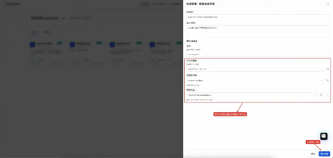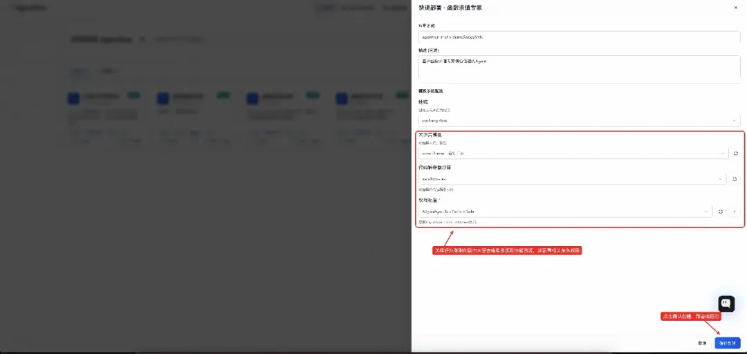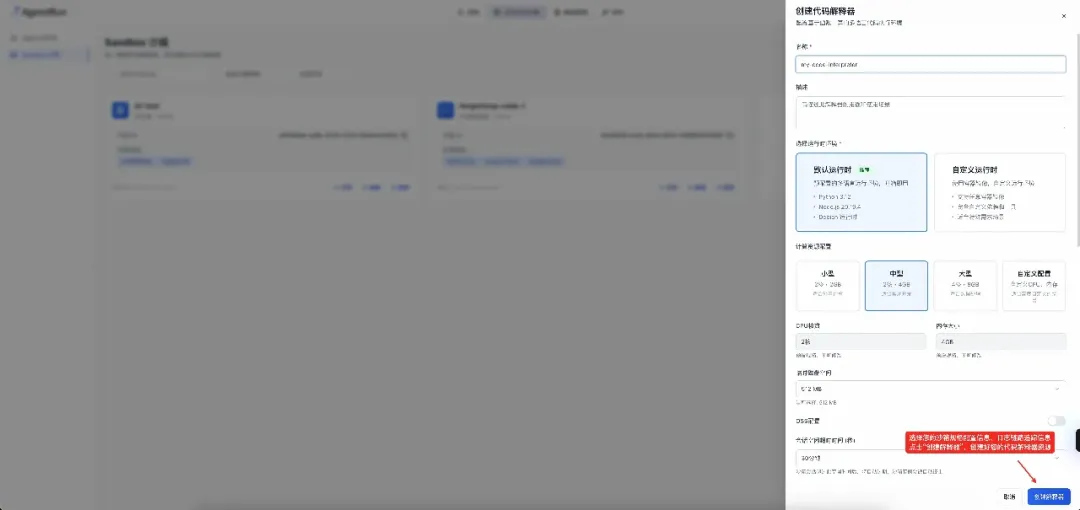 选择刚刚创建好的大语言模型和沙箱资源,点击确认创建,创建此 Agent 应用