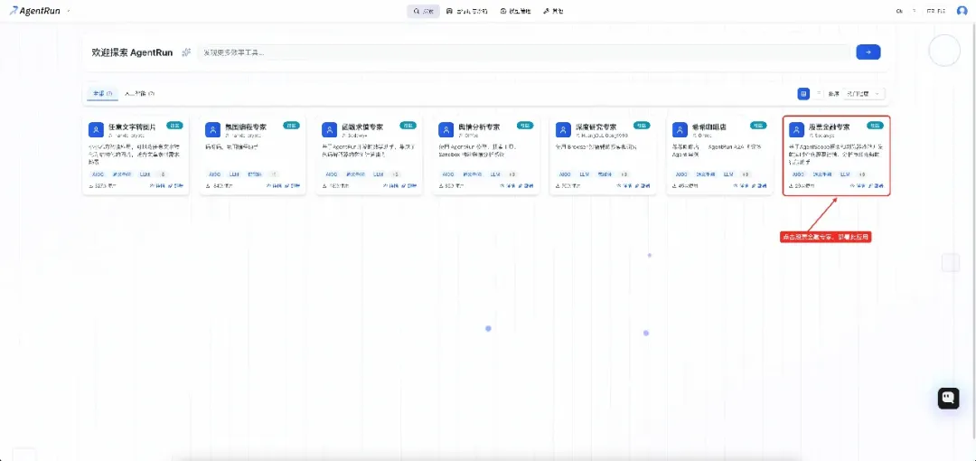 进入探索页面,点击股票金融专家快速部署您的 Agent 应用