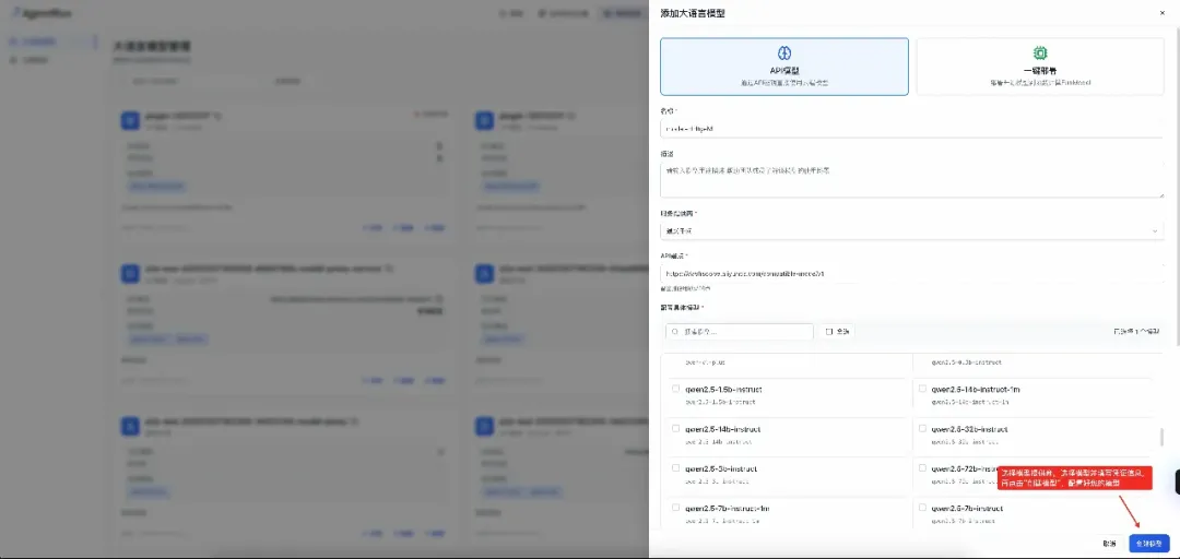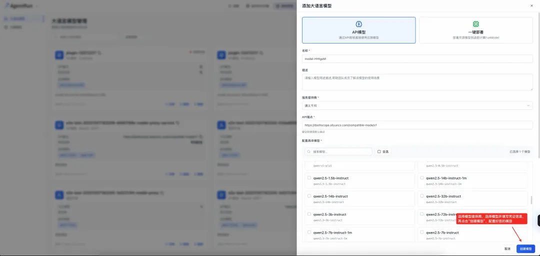 选择模型供应商、选择模型、配置凭证并点击创建模型,创建好您的模型
