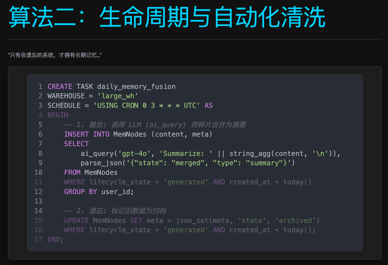 为此,他们利用 Databend 的 Task 构建了一套 Serverless ETL Pipeline。它允许开发者在数据库内部定义复杂的数据流转逻辑,将非结构化的对话流实时转化为结构化的记忆。