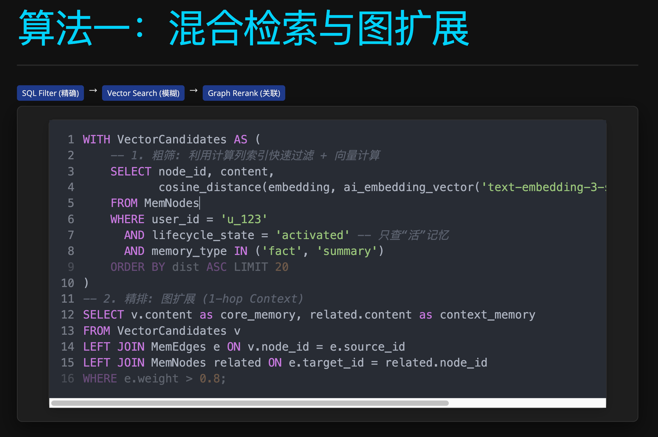 WITH HybridCandidates AS ( SELECT node_id, content, -- 向量距离:衡量语义相似度 (越小越相似) cosine_distance(embedding, :user_query_embedding) AS semantic_dist FROM MemNodes WHERE user_id = 'Bob' AND lifecycle_state = 'activated' -- 全文检索:利用倒排索引强制匹配关键词,确保精确度 AND QUERY('content:"Sourdough"') ORDER BY semantic_dist ASC LIMIT 20 ) -- 图谱扩展:拼接一跳关联 (如地点、评论) SELECT core.content AS core_memory, related.content AS context_memory, related.meta:topic AS context_topic FROM HybridCandidates core LEFT JOIN MemEdges e ON core.node_id = e.source_id LEFT JOIN MemNodes related ON e.target_id = related.node_id WHERE e.weight > 0.8;