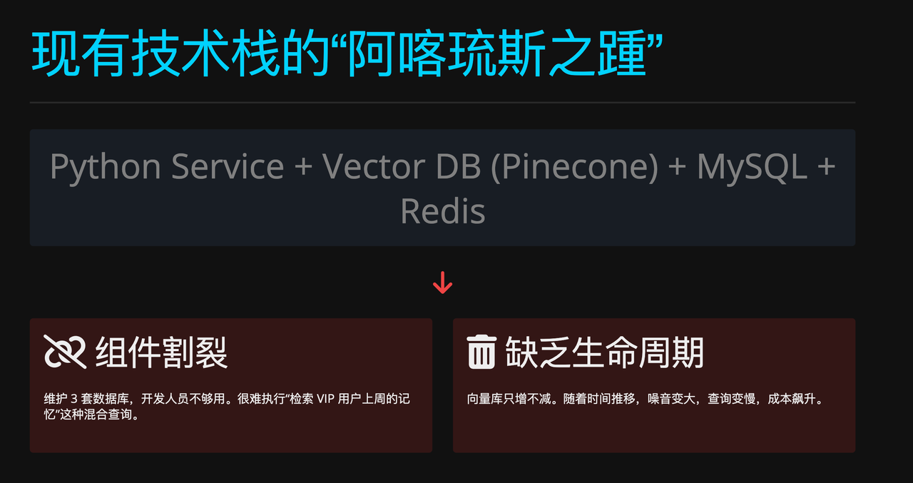 原有的技术栈采用了 "Python Service + Vector DB (Pinecone) + MySQL + Redis" 的组合。这种割裂的架构导致了维护成本高昂(需要维护 3 套数据库),且难以执行混合查询(例如“检索 VIP 用户上周的记忆”)。此外,缺乏生命周期管理导致向量库只增不减,随着时间推移,噪音变大,查询变慢,成本飙升。