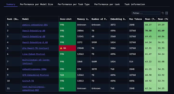 明确核心需求后,即可在 MTEB 排行榜中按特征筛选模型,从而找出既性能优异又符合实际条件的模型。