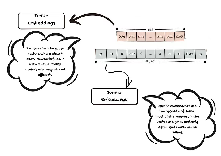 稠密嵌入使用的向量中,几乎每个位置都填充了有效数值。每个数值都承载着关于词语、句子、图像或文档的一点信息。稠密向量紧凑且高效,能在较小空间内存储大量细节内容,使计算机能更轻松地进行比对并快速发现相似性。