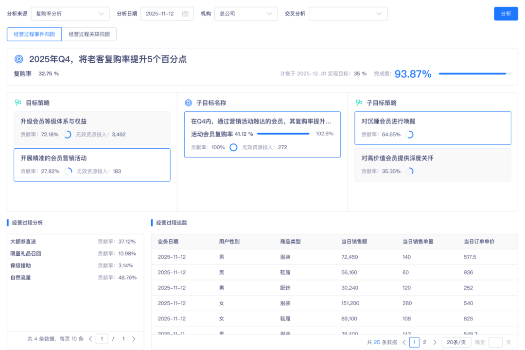 在那家零售企业的实践中,他们先在“经营目标管理”模块中确认季度复购率的目标,再在“经营策略管理”中,把端外广告、会员专属活动、积分激励等策略逐一登记,并为每一类策略绑定子目标和关键业务事件。此后,每当一笔订单完成,系统都会根据预设的归因规则,判断它与哪些策略相关,分别贡献了多少增量,最终沉淀成一张直观的“策略贡献图谱”。
