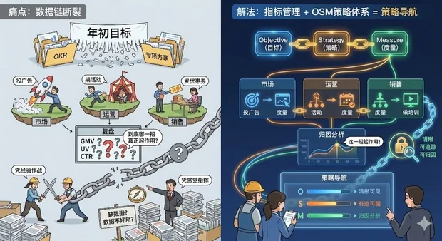 指标管理与 OSM 策略体系(Objective–Strategy–Measure)的结合,正在把这条链补出来:它不只是在帮你“看数”,而是在试图为企业装上一套“策略导航”——目标怎么定、策略怎么拆、过程怎么追、结果如何归因,以及,下一步该怎么调。