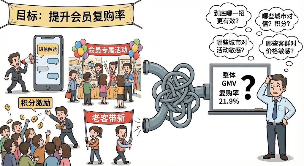 以一家零售企业为例,他们希望提升会员复购率。常见的操作路径是短信触达、会员专属活动、积分激励、老客带新等一股脑儿铺开。活动结束后,他们看到的是整体 GMV 和复购率的变化,却很难搞清楚到底是短信更有效,还是积分更有用,哪些城市对线下活动更敏感,哪些客群对价格更加敏感。