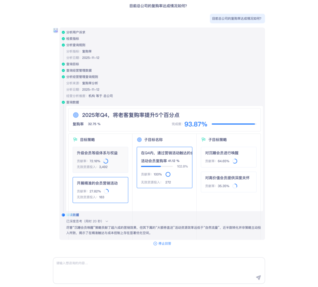 从组织视角看,决策周期从“先排队,再开会”缩短成了“随问随答”,但每一个回答背后,又都有指标体系和归因逻辑做支撑。