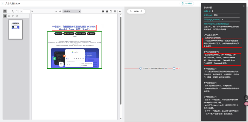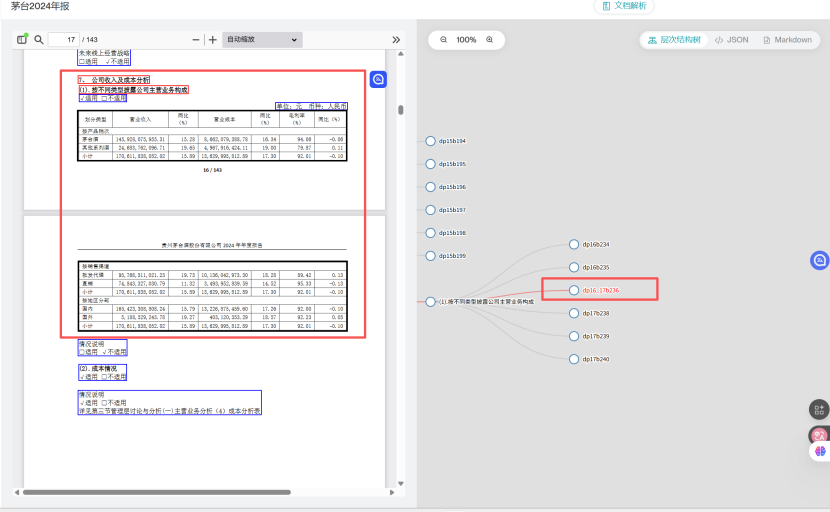 系统自动构建文档结构树,清晰展示标题、段落、图表之间的层级关系。用户可直观查看解析内容的组织方式,便于检查与确认。解析结果支持 JSON 或 Markdown 格式输出,便于后续接入大模型进行深度处理。