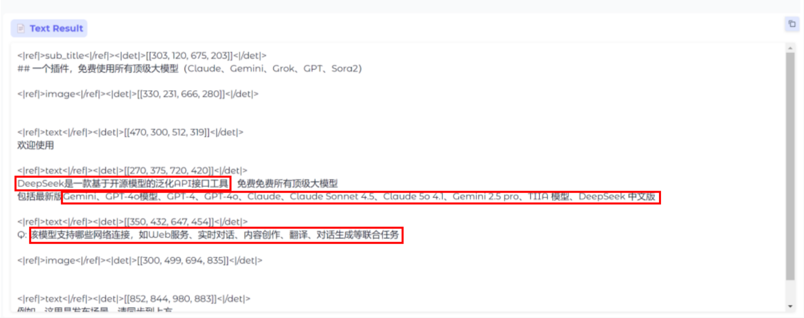 尽管 DeepSeek-OCR 在信息压缩与长文本处理方面具备潜力,但其核心目标并非精准还原文档内容,而是探索 AI 如何通过视觉进行信息压缩与记忆。因此,在还原复杂版面结构、图表内容及上下文关联等方面表现有限,甚至在识别过程中可能出现“幻觉现象”,输出解析了不存在的信息。