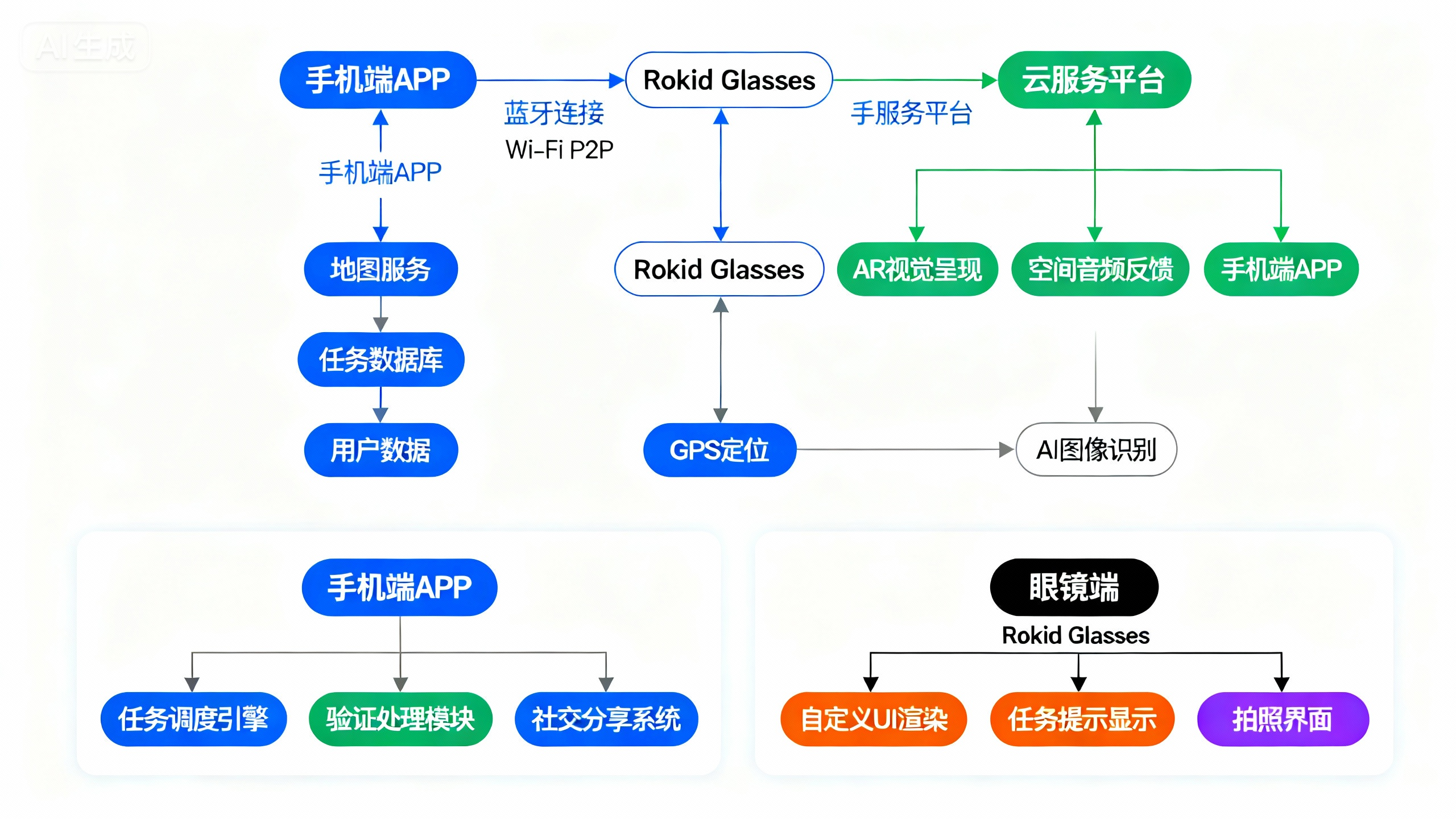 城市 AR 寻宝系统采用"手机端+眼镜端"的协同架构,充分发挥各自优势: