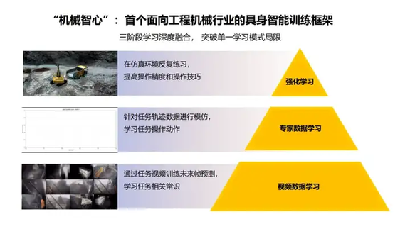 网易灵动认为,当前阶段具身智能在工程机械领域会先行落地。在挖掘机装车场景中,“感知-决策-规划-控制”的传统框架由人为设计,限制了系统的灵活性和泛化能力。为此,网易灵动发布“机械智心”具身智能训练框架,用强化学习(仿真环境反复练习)、专家数据学习(模仿挖机师傅的轨迹)、视频数据学习(从视频里学常识)三阶段融合的方式,突破单一学习模式的局限。