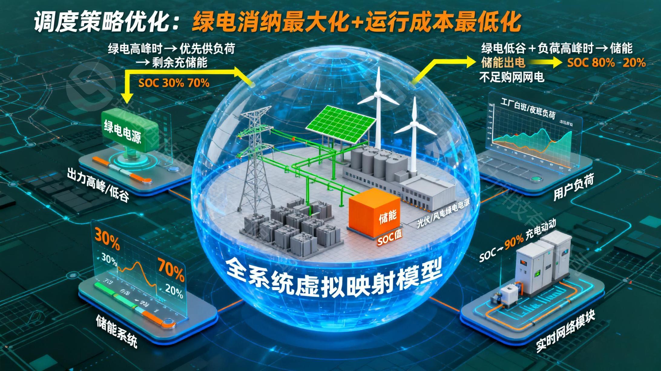 调度策略优化:以 “绿电消纳最大化 + 运行成本最低化” 为目标,生成动态调度方案;绿电出力高峰时,优先满足负荷需求,剩余电量触发储能充电(SOC 从 30% 充至 80%),避免弃电;绿电出力低谷且负荷高峰(如工厂夜班生产)时,先调用储能放电(SOC 从 80% 放至 20%),不足部分再从电网购电,降低购电成本。