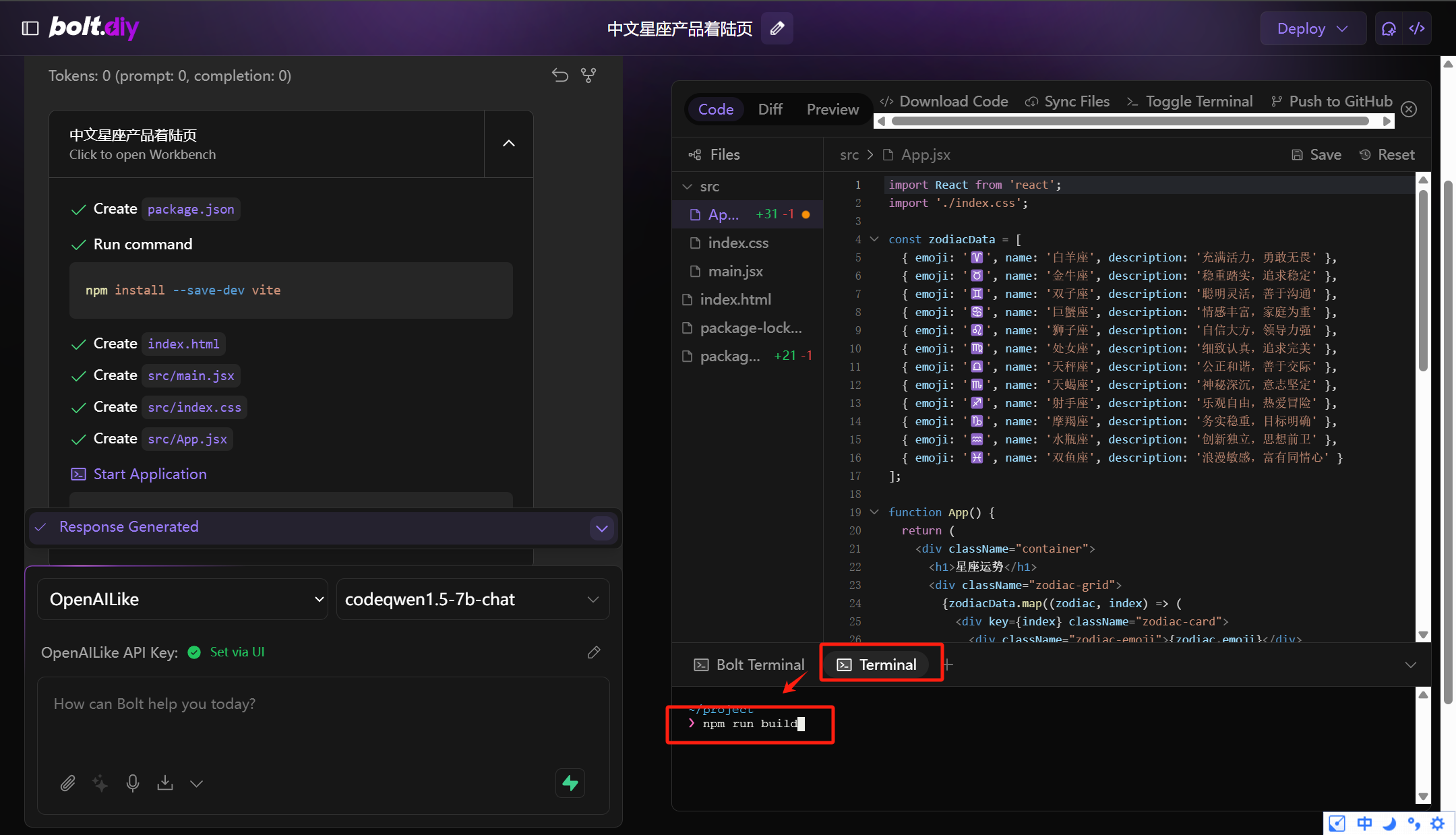 - Shell commands to run including dependencies to install using a package manager (NPM) - Files to create and their contents - Folders to create if necessary